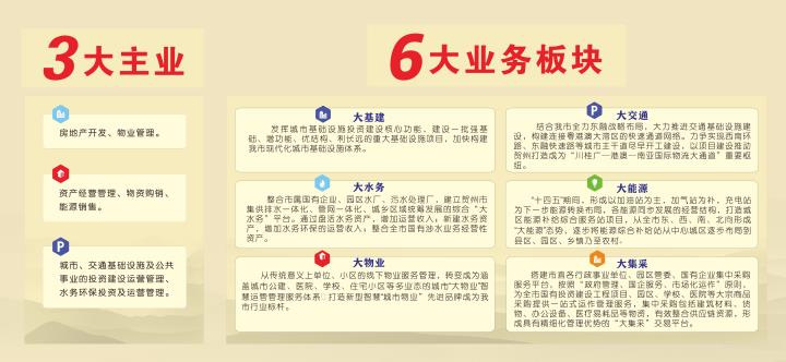 城投集團立足戰略布局,持續優化布局結構,主責主業更加突出。2021年,根據市委部署要求,城投集團與原交投集團進行重組合并。合并后的城投集團定位為以承擔基礎設施投資建設、提供公共服務和產品、土地開發經營利用為三大核心功能的經營實體。根據三大核心功能定位,城投集團研究確定了“三大主業六大板塊”的發展思路,提出“大基建、大交通、大水務、大能源、大物業、大集采”等六大轉型發展新板塊,同步推進建筑材料貿易、賀州智慧停車、金融押運、小額貸款、特許經營等輔助業務,支撐核心業務發展,做大現金流、做強企業實力、做優企業資產。