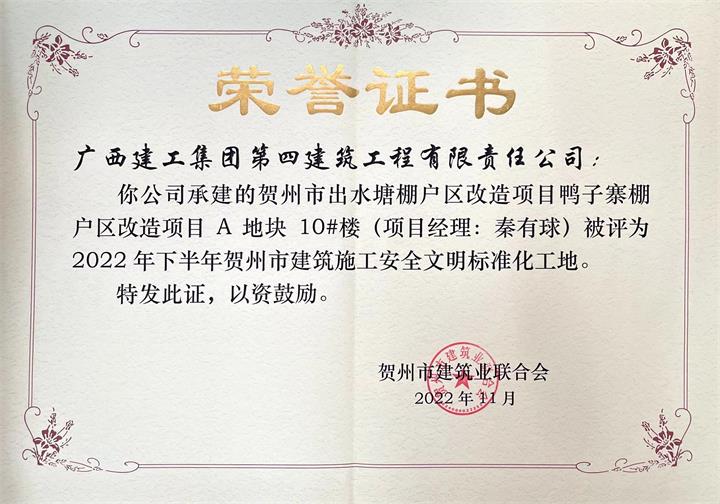 打造“高標(biāo)準(zhǔn)”文明工地。以標(biāo)準(zhǔn)化制度為主線,實現(xiàn)人員“進(jìn)場流程、安全檢查、安全設(shè)施、安全防護(hù)”標(biāo)準(zhǔn)化,建立13個在建項目微信交流群,每日報送項目建設(shè)情況,全方位推進(jìn)文明工地建設(shè)。公司實施的平安居棚改項目、出水塘鴨子寨棚改項目均榮獲“2022年下半年賀州市建設(shè)工程施工安全文明標(biāo)準(zhǔn)化工地”。