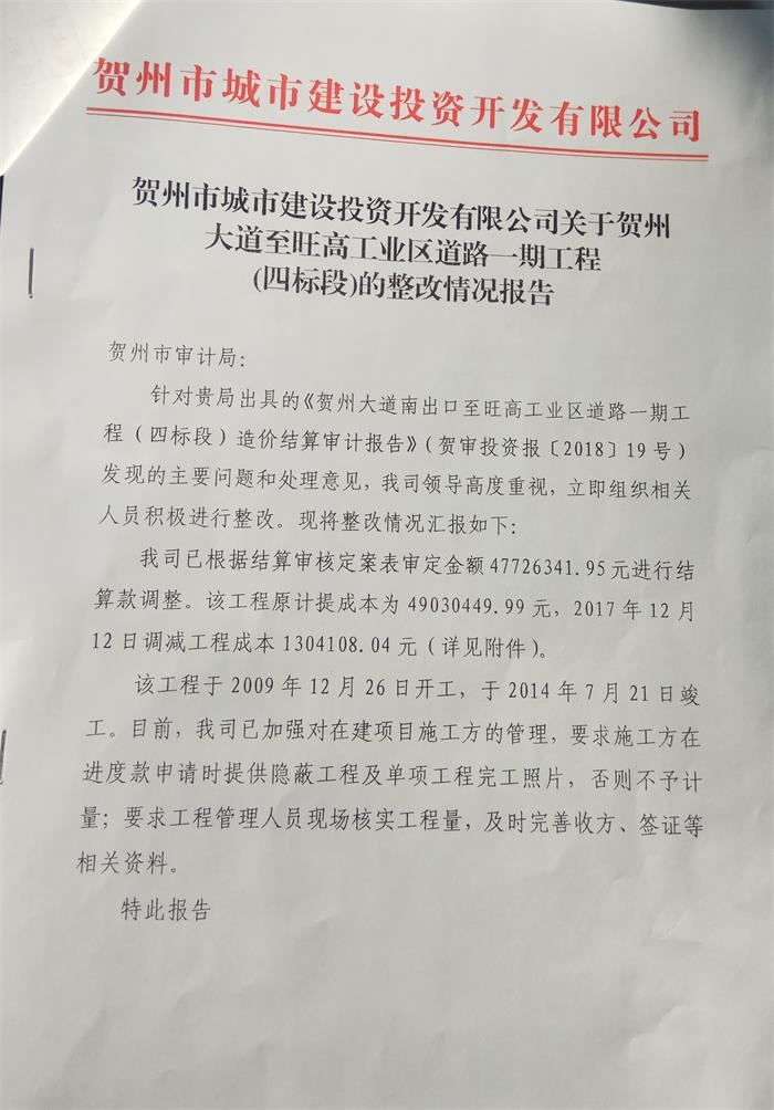 賀州市城市建設投資開發有限公司關于賀州市江南路網一期工程六、七標段審計發現問題整改情況的報告 pdf